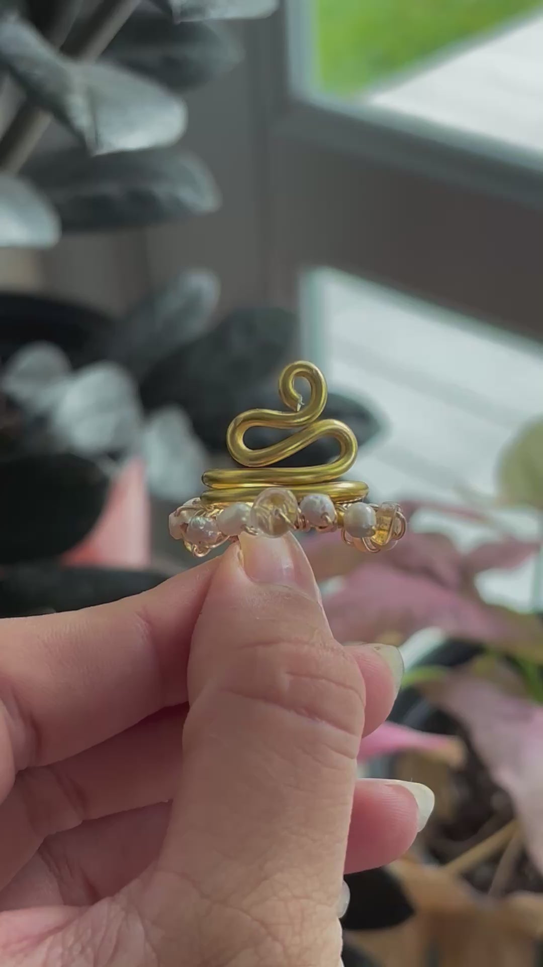 Forjado a mano en alambre dorado, y adornado con tres gemas mágicas: citrino para la abundancia, clear quartz para amplificar tu energía y perla de agua dulce para anclarte en tu sabiduría emocional.